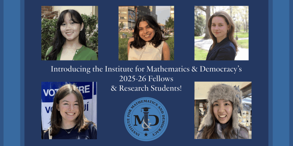 Last but not least, Elaine Zhao is a member of the Wellesley College Class of 2027. She is pursuing a double major in Data Science and English on a pre-law track. She is interested in exploring the intersection of law, mathematics, and technology, particularly how mathematical tools can help predict trends and enhance democratic processes. As an IMD fellow, she’s looking forward to studying gerrymandering using geometric knowledge.
