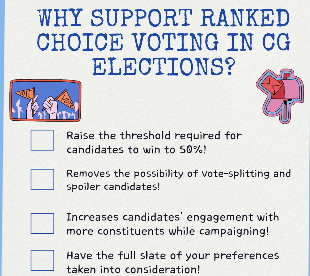 To address these issues, I am proposing that CG implement ranked choice voting and instant runoffs for the annual Cabinet elections. This means that voters can rank candidates in preferential order. If there is no majority winner, the candidate with the least first place votes is removed, and the votes are redistributed. The process continues until there is a majority winner.