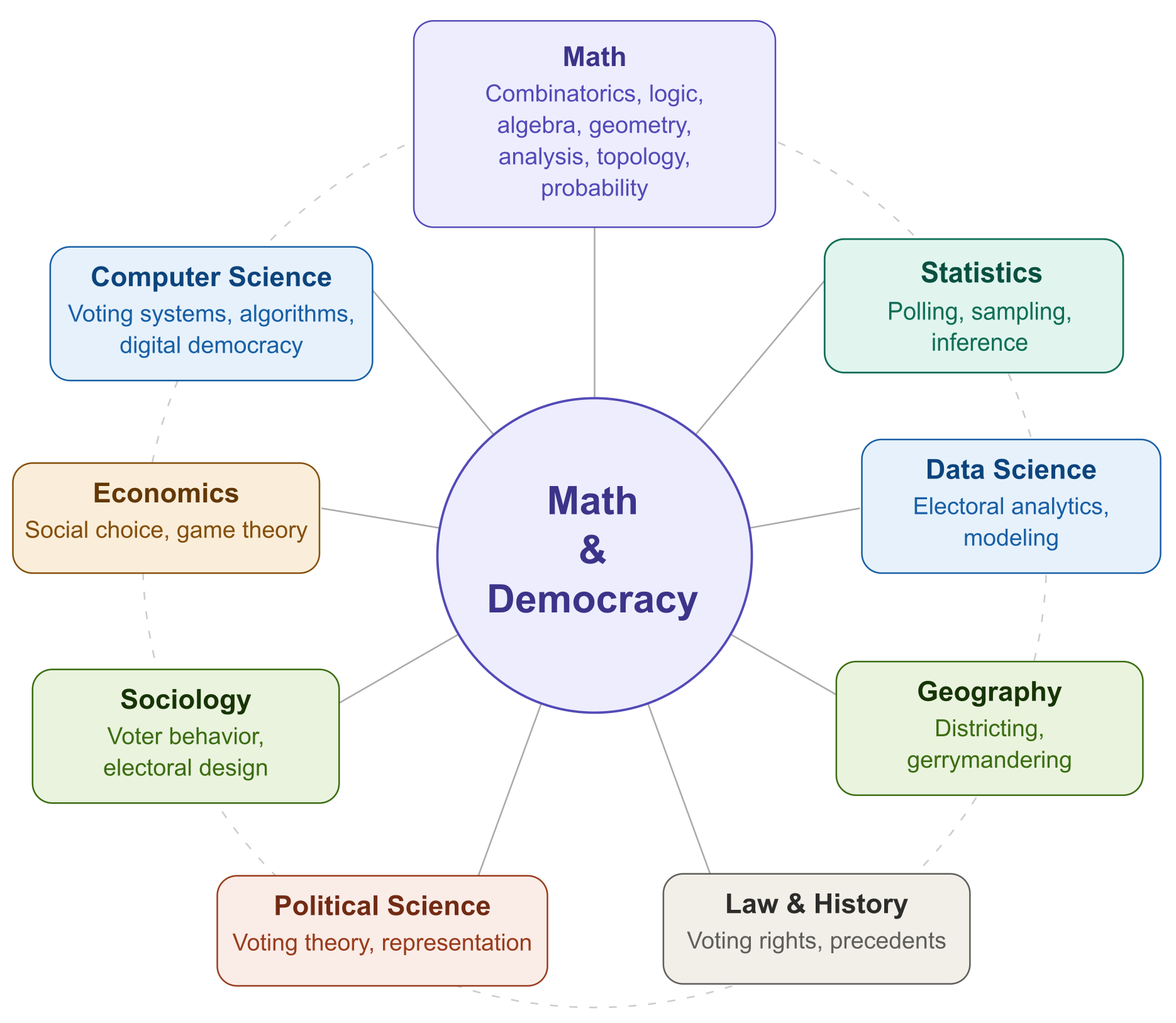 - Gerrymandering: Gerrymandering is the practice of redrawing electoral districts in a manner that creates an advantage for a political party. Algorithmic approaches to the study of gerrymandering include algorithms for detection of gerrymandering, algorithms to undo gerrymandering based on specified mathematical goals, and models of gerrymandering over graphs.